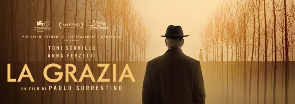 Ne La Grazia c’è un solo protagonista, ma una moltitudine di invenzioni cinematografiche sospese tra reale e surreale, metafore e paradossi, dramma e ironia. Ho sempre pensato che sia molto difficile giudicare i film di Paolo Sorrentino: i suoi compiacimenti fotografici possono apparire ridondanti formalismi, le sue divagazioni involute “licenze poetiche”, i suoi personaggi stereotipi esistenziali; dunque, anche questo film potrà sembrare appesantito da una esibita autoreferenzialità. Ma il cinema d’autore è così: non solo soggetto, sceneggiatura e regia collegati da un unico pensiero, ma probabilmente tante invenzioni estemporanee, continue pulsioni creative che condizionano il film e lo costruiscono anche in corso d’opera.